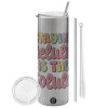 Delulu, Tumbler ποτήρι θερμό Ασημένιο από ανοξείδωτο ατσάλι 600ml, με μεταλλικό καλαμάκι & βούρτσα καθαρισμού