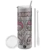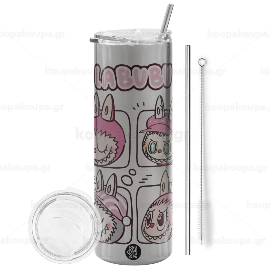 Labubu pink, Tumbler ποτήρι θερμό Ασημένιο από ανοξείδωτο ατσάλι 600ml, με μεταλλικό καλαμάκι & βούρτσα καθαρισμού