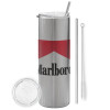 Marlboro, Tumbler ποτήρι θερμό Ασημένιο από ανοξείδωτο ατσάλι 600ml, με μεταλλικό καλαμάκι & βούρτσα καθαρισμού