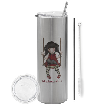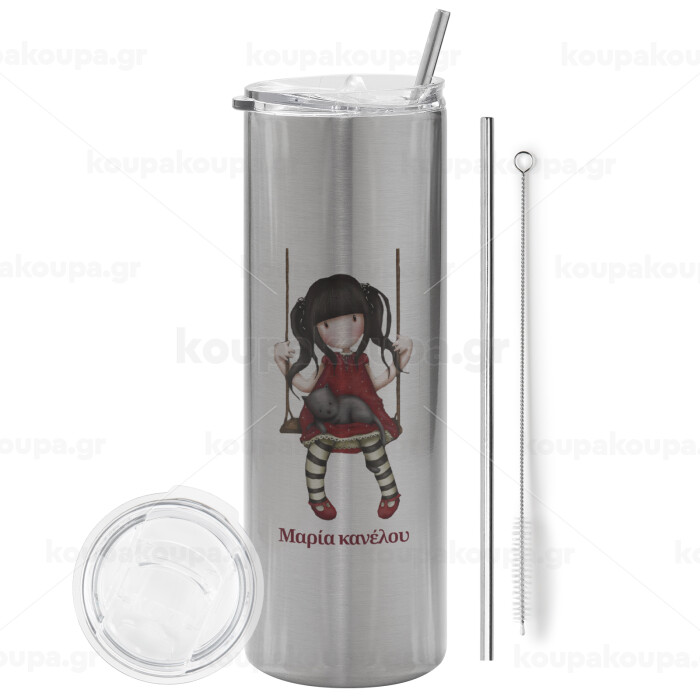Santoro, Tumbler ποτήρι θερμό Ασημένιο από ανοξείδωτο ατσάλι 600ml, με μεταλλικό καλαμάκι & βούρτσα καθαρισμού