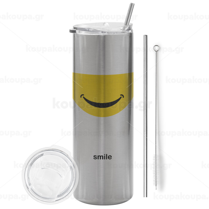 Smile Mug, Tumbler ποτήρι θερμό Ασημένιο από ανοξείδωτο ατσάλι 600ml, με μεταλλικό καλαμάκι & βούρτσα καθαρισμού