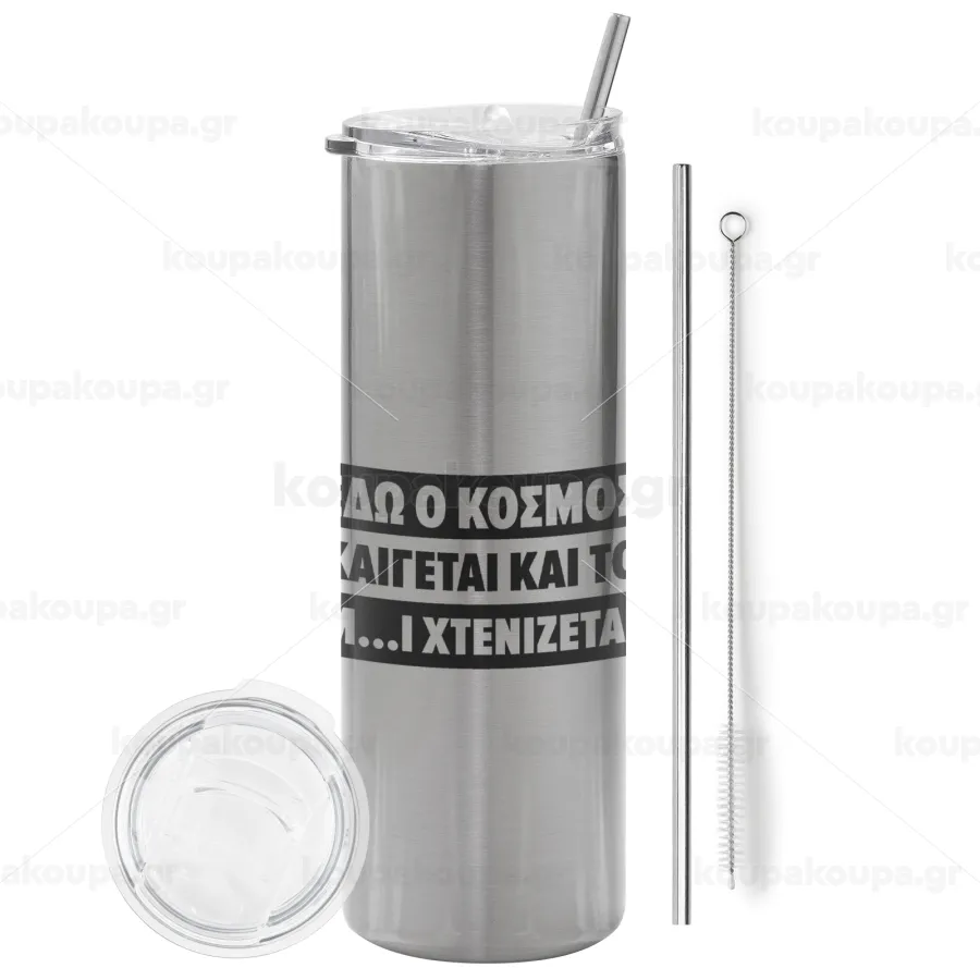 Εδώ ο κόσμος καίγεται και το Μ....Ι χτενίζεται, Tumbler ποτήρι θερμό Ασημένιο από ανοξείδωτο ατσάλι 600ml, με μεταλλικό καλαμάκι & βούρτσα καθαρισμού