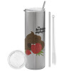 Τι θα φάμε σημερα???, Tumbler ποτήρι θερμό Ασημένιο από ανοξείδωτο ατσάλι 600ml, με μεταλλικό καλαμάκι & βούρτσα καθαρισμού