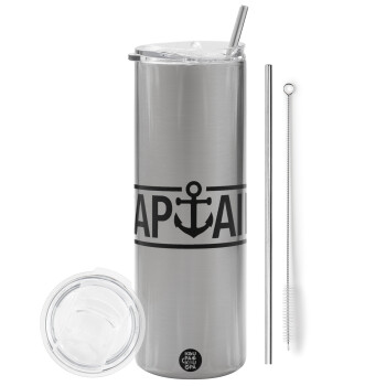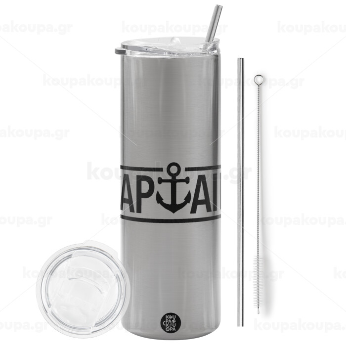 CAPTAIN, Tumbler ποτήρι θερμό Ασημένιο από ανοξείδωτο ατσάλι 600ml, με μεταλλικό καλαμάκι & βούρτσα καθαρισμού