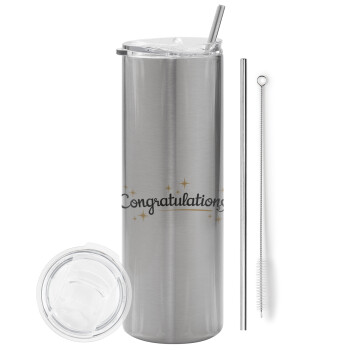 Congratulations, Tumbler ποτήρι θερμό Ασημένιο από ανοξείδωτο ατσάλι 600ml, με μεταλλικό καλαμάκι & βούρτσα καθαρισμού