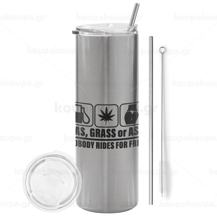 Gas, Grass or Ass, Tumbler ποτήρι θερμό Ασημένιο από ανοξείδωτο ατσάλι 600ml, με μεταλλικό καλαμάκι & βούρτσα καθαρισμού