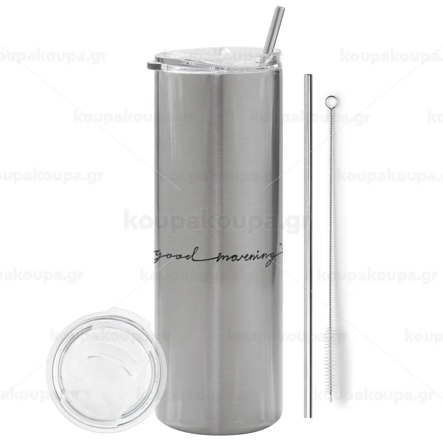 Good morning, Tumbler ποτήρι θερμό Ασημένιο από ανοξείδωτο ατσάλι 600ml, με μεταλλικό καλαμάκι & βούρτσα καθαρισμού