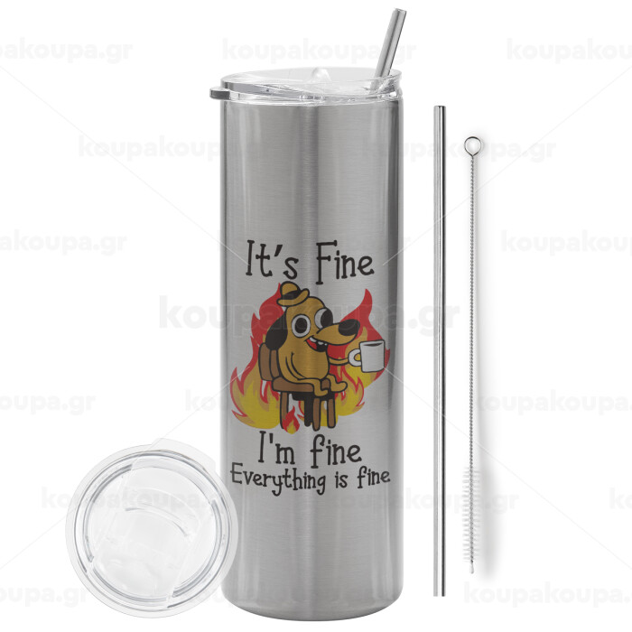 It's Fine I'm Fine Everything Is Fine, Tumbler ποτήρι θερμό Ασημένιο από ανοξείδωτο ατσάλι 600ml, με μεταλλικό καλαμάκι & βούρτσα καθαρισμού