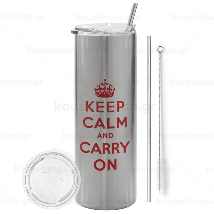 KEEP CALM  and carry on, Tumbler ποτήρι θερμό Ασημένιο από ανοξείδωτο ατσάλι 600ml, με μεταλλικό καλαμάκι & βούρτσα καθαρισμού