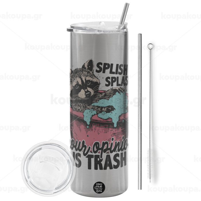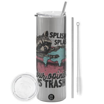 Splish splash your opinion is trash, Tumbler ποτήρι θερμό Ασημένιο από ανοξείδωτο ατσάλι 600ml, με μεταλλικό καλαμάκι & βούρτσα καθαρισμού