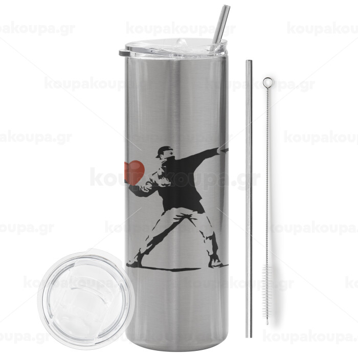Banksy (The heart thrower), Tumbler ποτήρι θερμό Ασημένιο από ανοξείδωτο ατσάλι 600ml, με μεταλλικό καλαμάκι & βούρτσα καθαρισμού