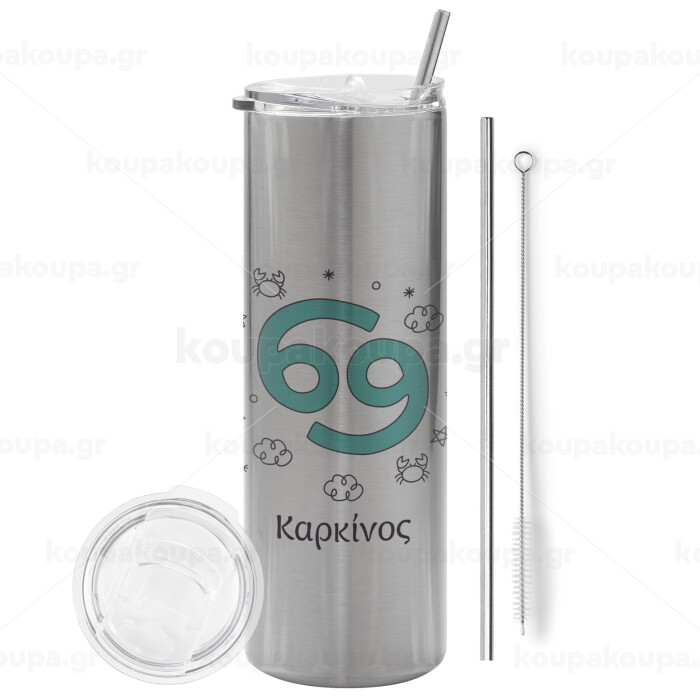 Ζώδια Καρκίνος, Tumbler ποτήρι θερμό Ασημένιο από ανοξείδωτο ατσάλι 600ml, με μεταλλικό καλαμάκι & βούρτσα καθαρισμού