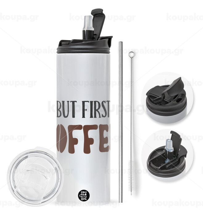 But first Coffee, Travel Tumbler θερμό με διπλό καπάκι, μεταλλικό καλαμάκι και βούρτσα καθαρισμού (Ανωξείδωτο 304 Food grade, BPA free, 600ml)