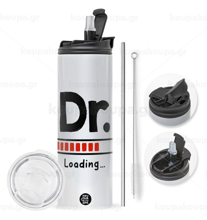 DR. Loading..., Travel Tumbler θερμό με διπλό καπάκι, μεταλλικό καλαμάκι και βούρτσα καθαρισμού (Ανωξείδωτο 304 Food grade, BPA free, 600ml)