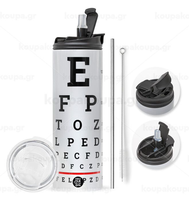 EYE test chart, Travel Tumbler θερμό με διπλό καπάκι, μεταλλικό καλαμάκι και βούρτσα καθαρισμού (Ανωξείδωτο 304 Food grade, BPA free, 600ml)
