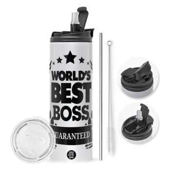 World's best boss stars, Travel Tumbler θερμό με διπλό καπάκι, μεταλλικό καλαμάκι και βούρτσα καθαρισμού (Ανωξείδωτο 304 Food grade, BPA free, 600ml)