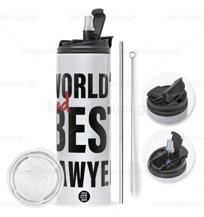 2nd, World Best Lawyer , Travel Tumbler θερμό με διπλό καπάκι, μεταλλικό καλαμάκι και βούρτσα καθαρισμού (Ανωξείδωτο 304 Food grade, BPA free, 600ml)