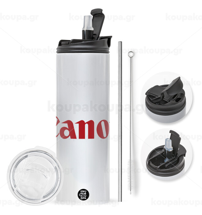 Canon, Travel Tumbler θερμό με διπλό καπάκι, μεταλλικό καλαμάκι και βούρτσα καθαρισμού (Ανωξείδωτο 304 Food grade, BPA free, 600ml)