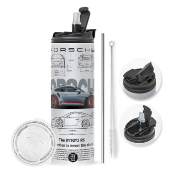 Porsche, Travel Tumbler θερμό με διπλό καπάκι, μεταλλικό καλαμάκι και βούρτσα καθαρισμού (Ανωξείδωτο 304 Food grade, BPA free, 600ml)