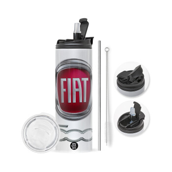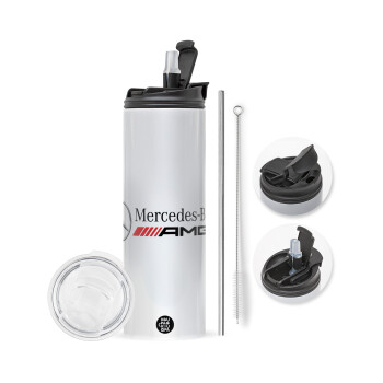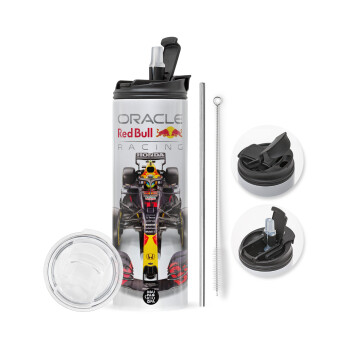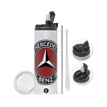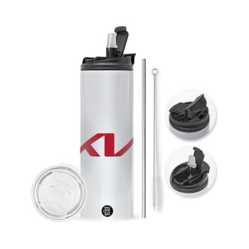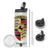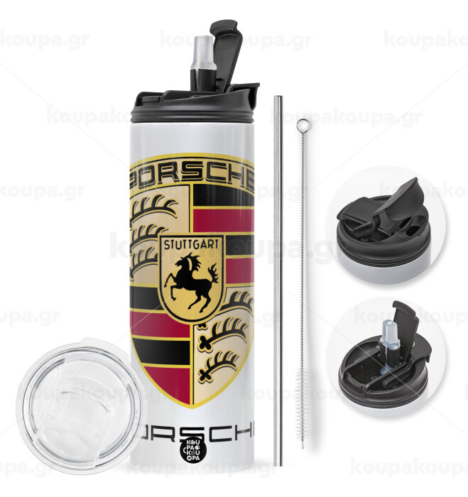 Porsche, Travel Tumbler θερμό με διπλό καπάκι, μεταλλικό καλαμάκι και βούρτσα καθαρισμού (Ανωξείδωτο 304 Food grade, BPA free, 600ml)