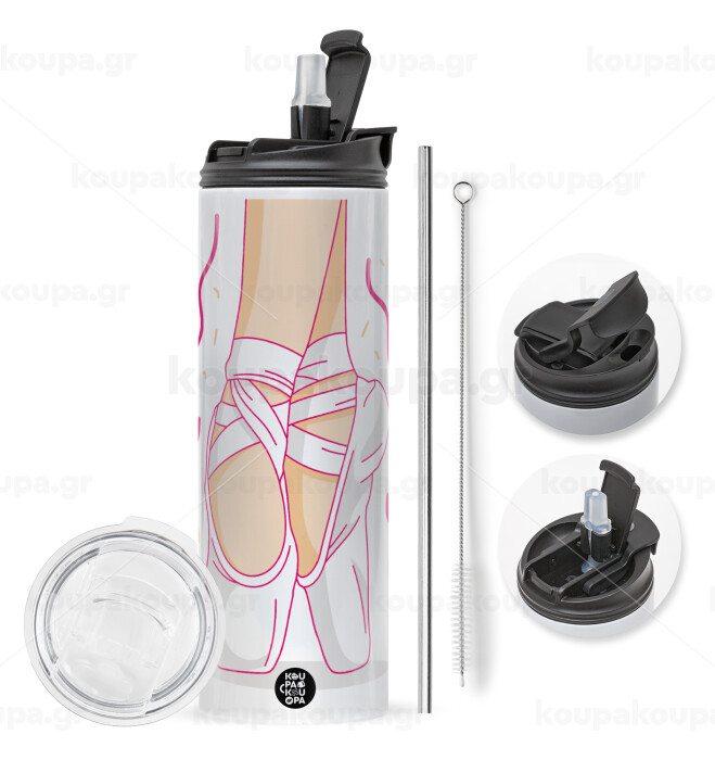 Πουεντ, Travel Tumbler θερμό με διπλό καπάκι, μεταλλικό καλαμάκι και βούρτσα καθαρισμού (Ανωξείδωτο 304 Food grade, BPA free, 600ml)