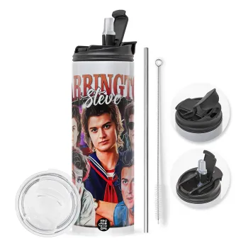 Steve Harrington, Stranger Things, Travel Tumbler θερμό με διπλό καπάκι, μεταλλικό καλαμάκι και βούρτσα καθαρισμού (Ανωξείδωτο 304 Food grade, BPA free, 600ml)