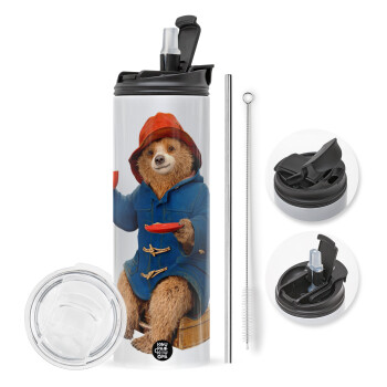 Αρκουδάκι Πάντινγκτον, Travel Tumbler θερμό με διπλό καπάκι, μεταλλικό καλαμάκι και βούρτσα καθαρισμού (Ανωξείδωτο 304 Food grade, BPA free, 600ml)