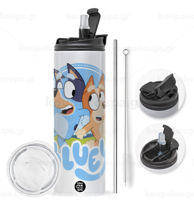 Μπλε, Travel Tumbler θερμό με διπλό καπάκι, μεταλλικό καλαμάκι και βούρτσα καθαρισμού (Ανωξείδωτο 304 Food grade, BPA free, 600ml)
