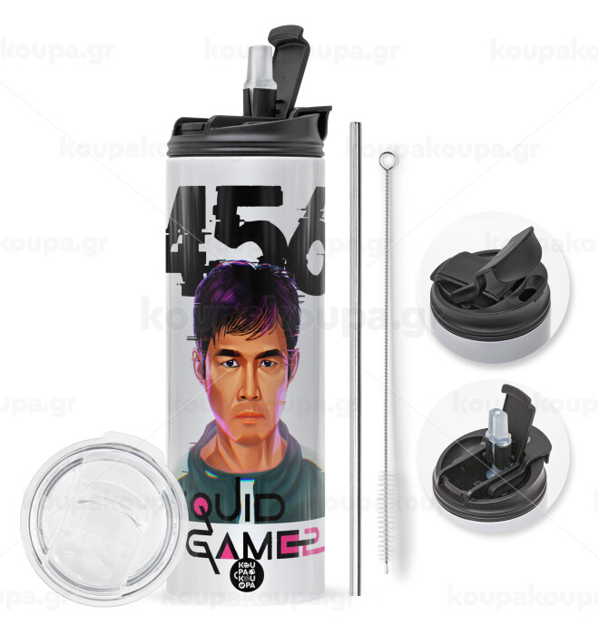 Squid game 456 Gi-Hun, Travel Tumbler θερμό με διπλό καπάκι, μεταλλικό καλαμάκι και βούρτσα καθαρισμού (Ανωξείδωτο 304 Food grade, BPA free, 600ml)