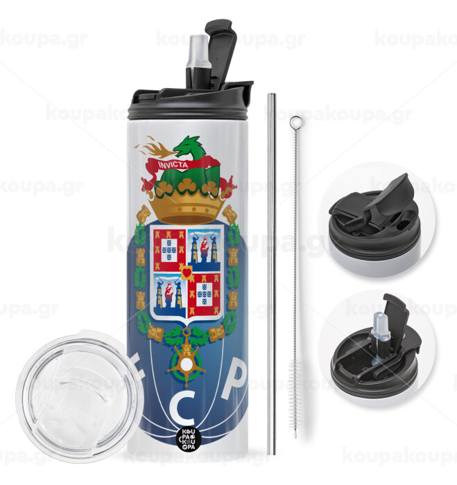 FCP, Travel Tumbler θερμό με διπλό καπάκι, μεταλλικό καλαμάκι και βούρτσα καθαρισμού (Ανωξείδωτο 304 Food grade, BPA free, 600ml)