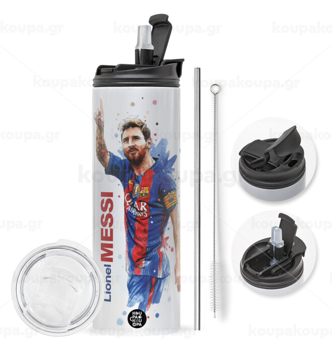 Λιονέλ Μέσι, Travel Tumbler θερμό με διπλό καπάκι, μεταλλικό καλαμάκι και βούρτσα καθαρισμού (Ανωξείδωτο 304 Food grade, BPA free, 600ml)