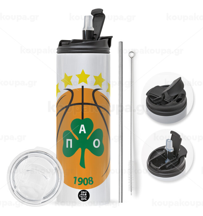 ΠΑΟ BC, Travel Tumbler θερμό με διπλό καπάκι, μεταλλικό καλαμάκι και βούρτσα καθαρισμού (Ανωξείδωτο 304 Food grade, BPA free, 600ml)