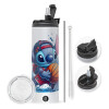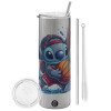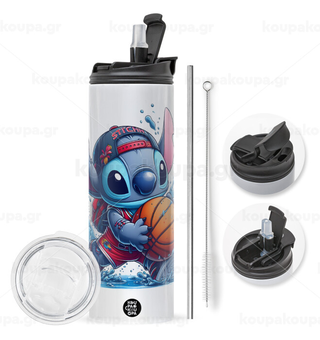 Stitch Basketball, Travel Tumbler θερμό με διπλό καπάκι, μεταλλικό καλαμάκι και βούρτσα καθαρισμού (Ανωξείδωτο 304 Food grade, BPA free, 600ml)