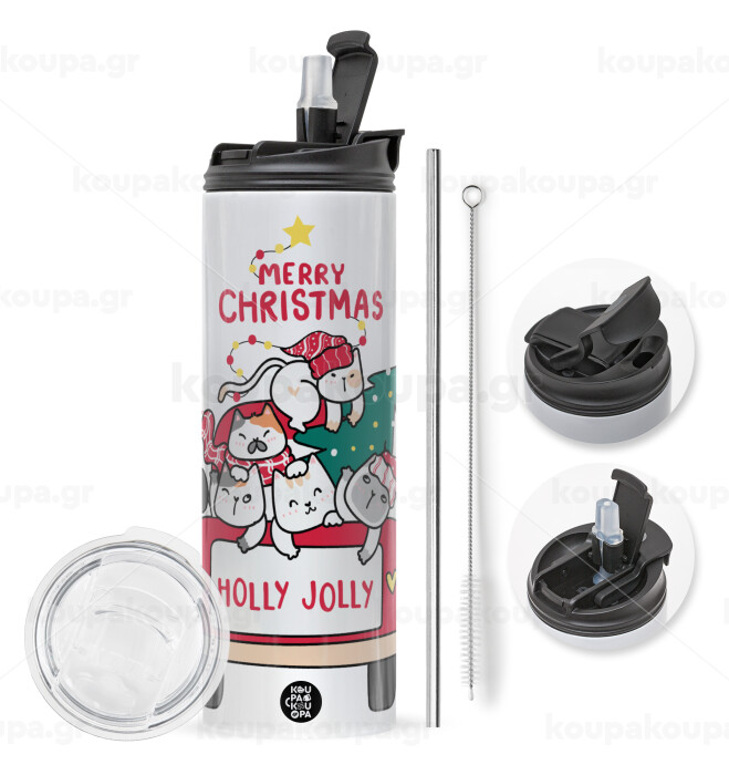 Merry Christmas cats in car, Travel Tumbler θερμό με διπλό καπάκι, μεταλλικό καλαμάκι και βούρτσα καθαρισμού (Ανωξείδωτο 304 Food grade, BPA free, 600ml)