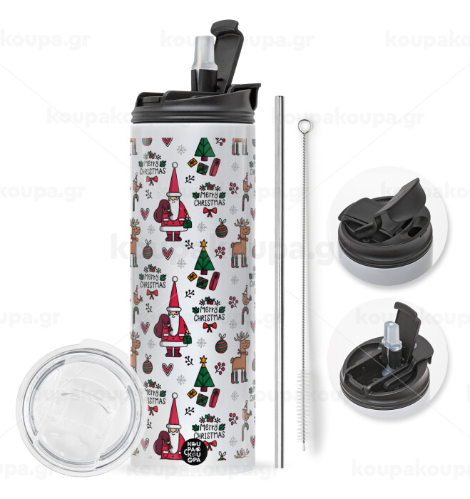 Santas, Deers & Trees, Travel Tumbler θερμό με διπλό καπάκι, μεταλλικό καλαμάκι και βούρτσα καθαρισμού (Ανωξείδωτο 304 Food grade, BPA free, 600ml)