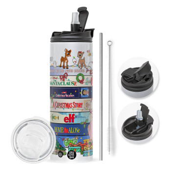 Xmas Classic movies, Travel Tumbler θερμό με διπλό καπάκι, μεταλλικό καλαμάκι και βούρτσα καθαρισμού (Ανωξείδωτο 304 Food grade, BPA free, 600ml)
