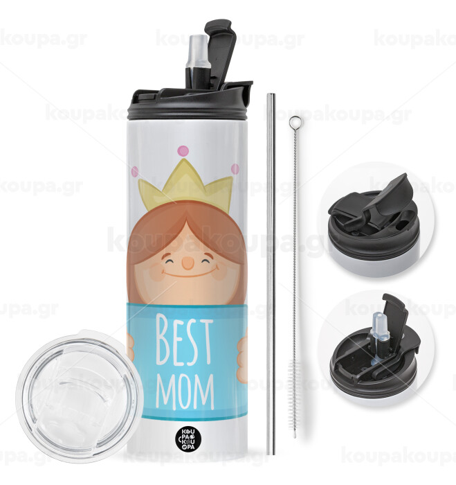 Best mom Princess, Travel Tumbler θερμό με διπλό καπάκι, μεταλλικό καλαμάκι και βούρτσα καθαρισμού (Ανωξείδωτο 304 Food grade, BPA free, 600ml)