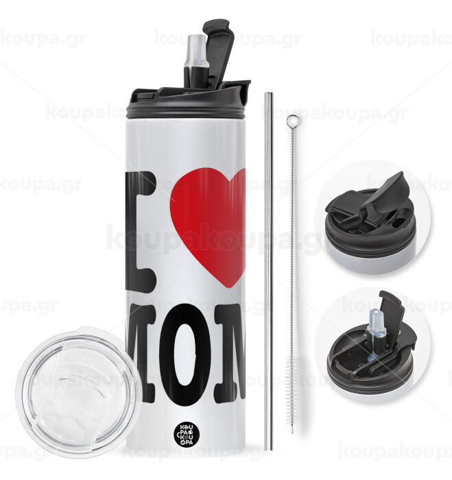 I LOVE MOM, Travel Tumbler θερμό με διπλό καπάκι, μεταλλικό καλαμάκι και βούρτσα καθαρισμού (Ανωξείδωτο 304 Food grade, BPA free, 600ml)