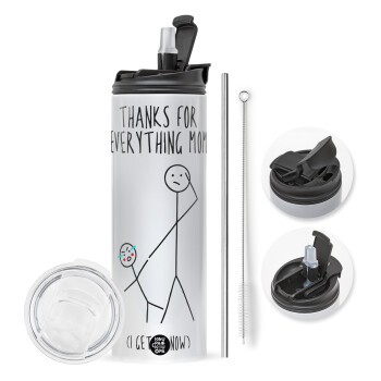 Thanks for everything mom, Travel Tumbler θερμό με διπλό καπάκι, μεταλλικό καλαμάκι και βούρτσα καθαρισμού (Ανωξείδωτο 304 Food grade, BPA free, 600ml)