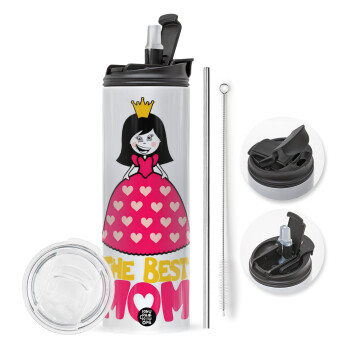 The Best Mom Queen, Travel Tumbler θερμό με διπλό καπάκι, μεταλλικό καλαμάκι και βούρτσα καθαρισμού (Ανωξείδωτο 304 Food grade, BPA free, 600ml)