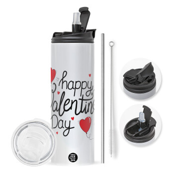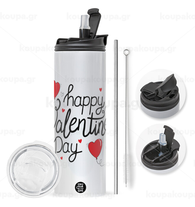 Happy Valentines Day!!!, Travel Tumbler θερμό με διπλό καπάκι, μεταλλικό καλαμάκι και βούρτσα καθαρισμού (Ανωξείδωτο 304 Food grade, BPA free, 600ml)