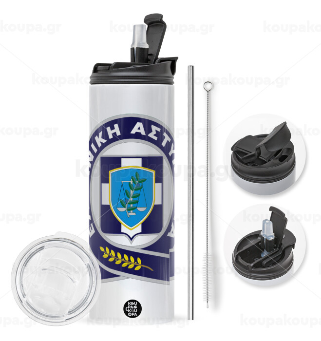 Ελληνική Αστυνομία, Travel Tumbler θερμό με διπλό καπάκι, μεταλλικό καλαμάκι και βούρτσα καθαρισμού (Ανωξείδωτο 304 Food grade, BPA free, 600ml)