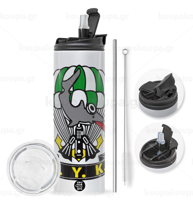 Ο.Υ.Κ., Travel Tumbler θερμό με διπλό καπάκι, μεταλλικό καλαμάκι και βούρτσα καθαρισμού (Ανωξείδωτο 304 Food grade, BPA free, 600ml)