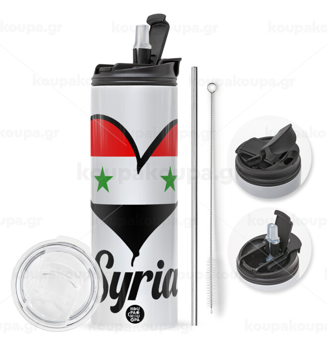 Syria flag, Travel Tumbler θερμό με διπλό καπάκι, μεταλλικό καλαμάκι και βούρτσα καθαρισμού (Ανωξείδωτο 304 Food grade, BPA free, 600ml)
