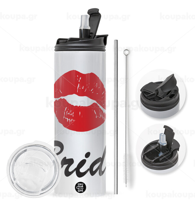 Bride kiss, Travel Tumbler θερμό με διπλό καπάκι, μεταλλικό καλαμάκι και βούρτσα καθαρισμού (Ανωξείδωτο 304 Food grade, BPA free, 600ml)