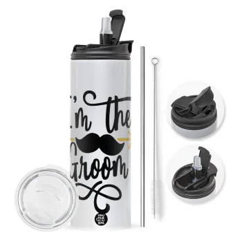 I'm the groom mustache, Travel Tumbler θερμό με διπλό καπάκι, μεταλλικό καλαμάκι και βούρτσα καθαρισμού (Ανωξείδωτο 304 Food grade, BPA free, 600ml)