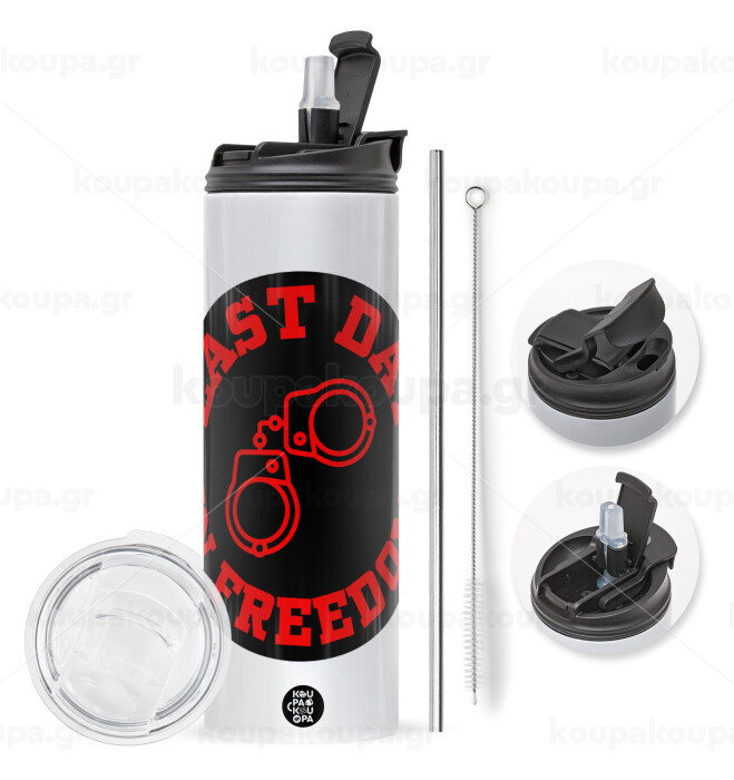 Last day in freedom, Travel Tumbler θερμό με διπλό καπάκι, μεταλλικό καλαμάκι και βούρτσα καθαρισμού (Ανωξείδωτο 304 Food grade, BPA free, 600ml)