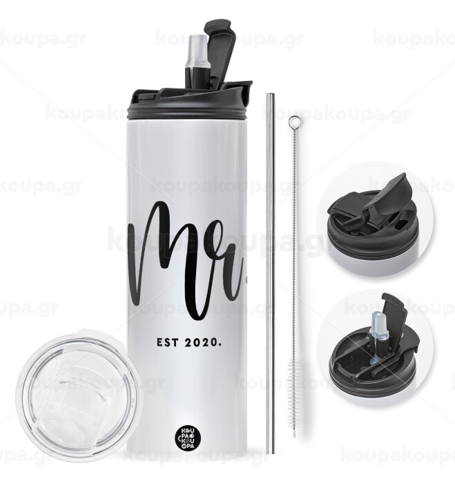 Mr & Mrs (Mr), Travel Tumbler θερμό με διπλό καπάκι, μεταλλικό καλαμάκι και βούρτσα καθαρισμού (Ανωξείδωτο 304 Food grade, BPA free, 600ml)