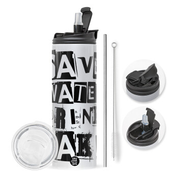 Save Water, Drink RAKI, Travel Tumbler θερμό με διπλό καπάκι, μεταλλικό καλαμάκι και βούρτσα καθαρισμού (Ανωξείδωτο 304 Food grade, BPA free, 600ml)