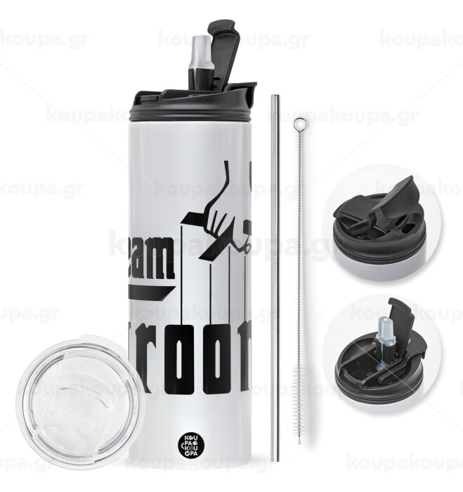 Team Groom, Travel Tumbler θερμό με διπλό καπάκι, μεταλλικό καλαμάκι και βούρτσα καθαρισμού (Ανωξείδωτο 304 Food grade, BPA free, 600ml)